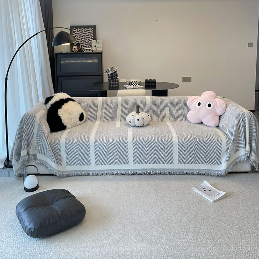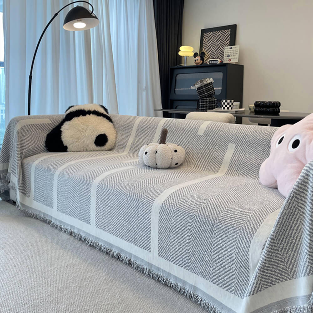 Herringbone Pattern Fringed Chenille Throw Couch Cover