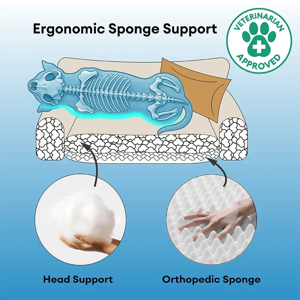 • Headrest Bolsters & Matching Pillow: Raised bolster sides and a detachable pillow provide head and neck support, giving your pet a secure and restful spot to lean into.