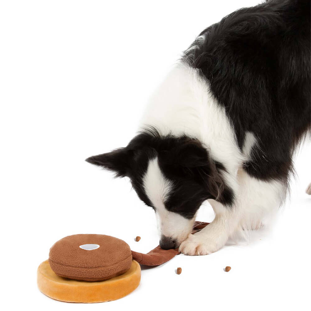 This Plush Squeaky Big Mac Dog Toy with squeaky fluffy bun attracts your pup's attention and exercises the tacit between you and your pup. Rattle cheese and lettuce leave him to indulge in the fun of sniffing game for a second. The multi-pocketed tomato slice and beef provide dogs with different difficulties in hiding food game, which effectively relieves your pup's anxiety and consumes excess energy at the same time.